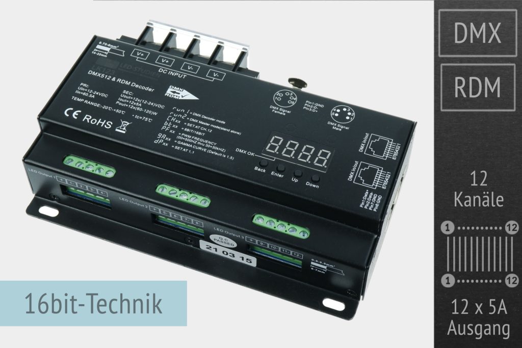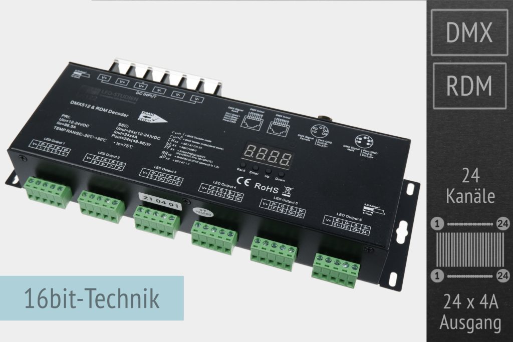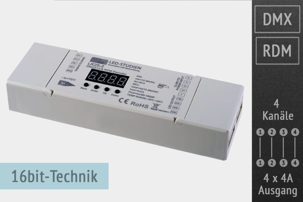 Für viele Anwendungen ist die Auflösung in 256 Schritten absolut ausreichend. Sind aber sehr weiche Farb- und/oder Helligkeitsverläufe gefordert, kann die 8 Bit Auflösung zu grob sein und es werden Stufen und Sprünge erkennbar. Für diese Fälle gibt es spezielle DMX-LED-Controller, die auch mit 16 Bit Auflösung arbeiten können. Dies entspricht dann 65.536 Stufen entspricht. Diese Auflösung ist selbst für feinste Farbverläufe und ultra langsame Lichtfadings über mehrere Minuten mehr als ausreichend.