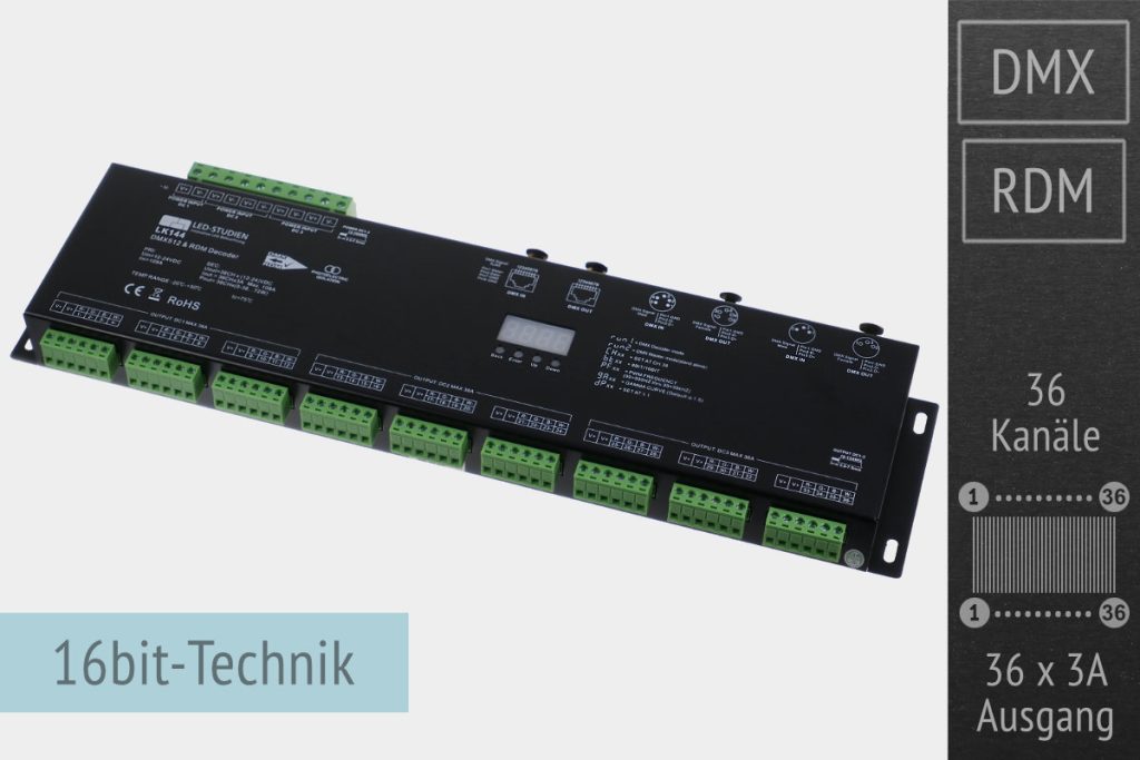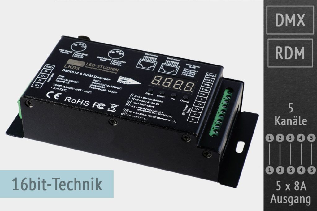 Je nach Größe der Installation benötigen die einzelnen LED-Streifen einiges an Leistung und daher auch DMX LED Controller, die diese Leistung am Ausgang zur Verfügung stellen können. Derartige Controller stellen dann nur wenige Kanäle bereit (z.B. 4 oder 5), aber diese eben mit einer sehr hohen Ausgangsleistung. LED-Streifen mit 10m, 20m oder mehr Länge können an diesen angeschlossen und gesteuert werden.